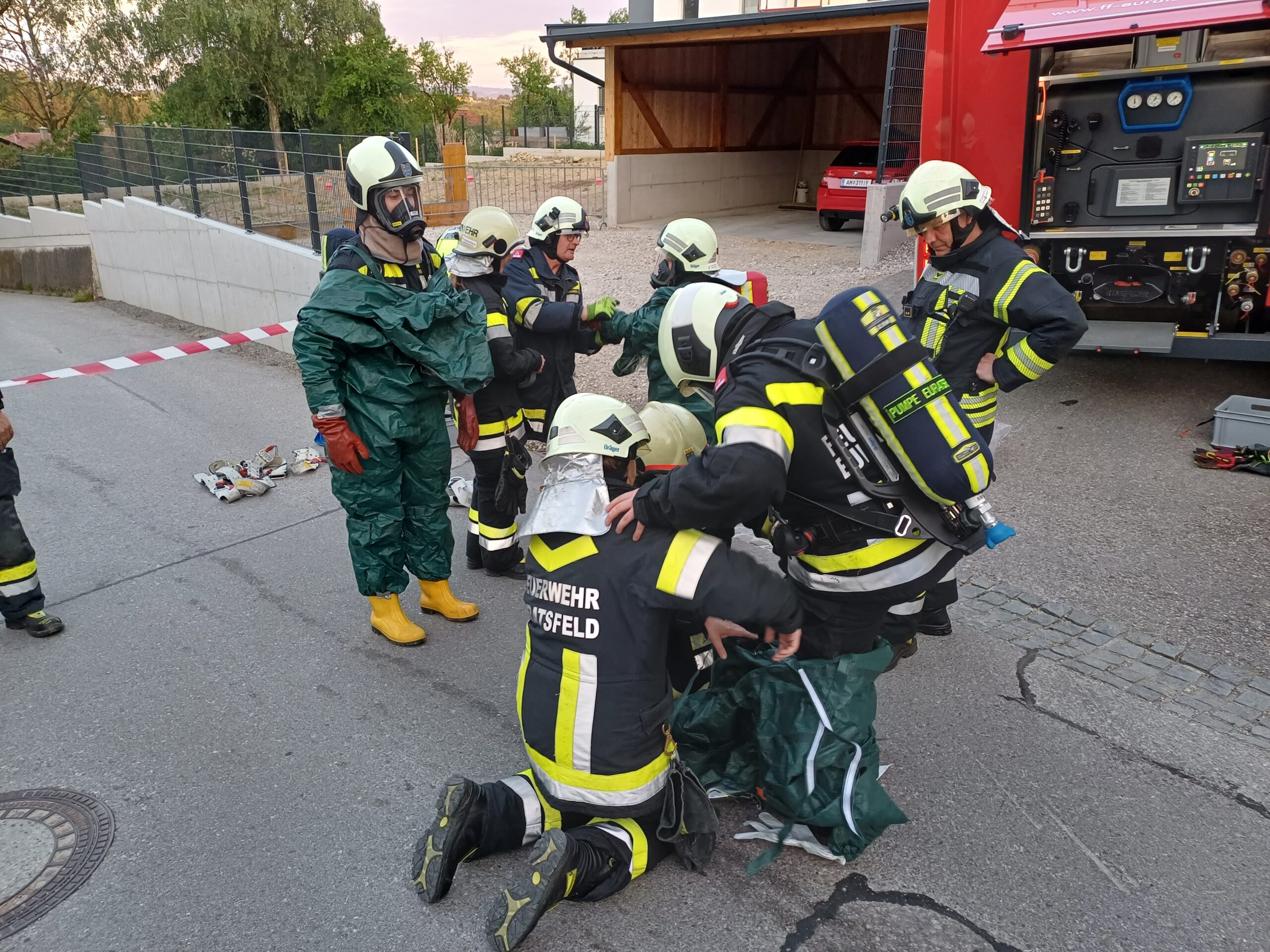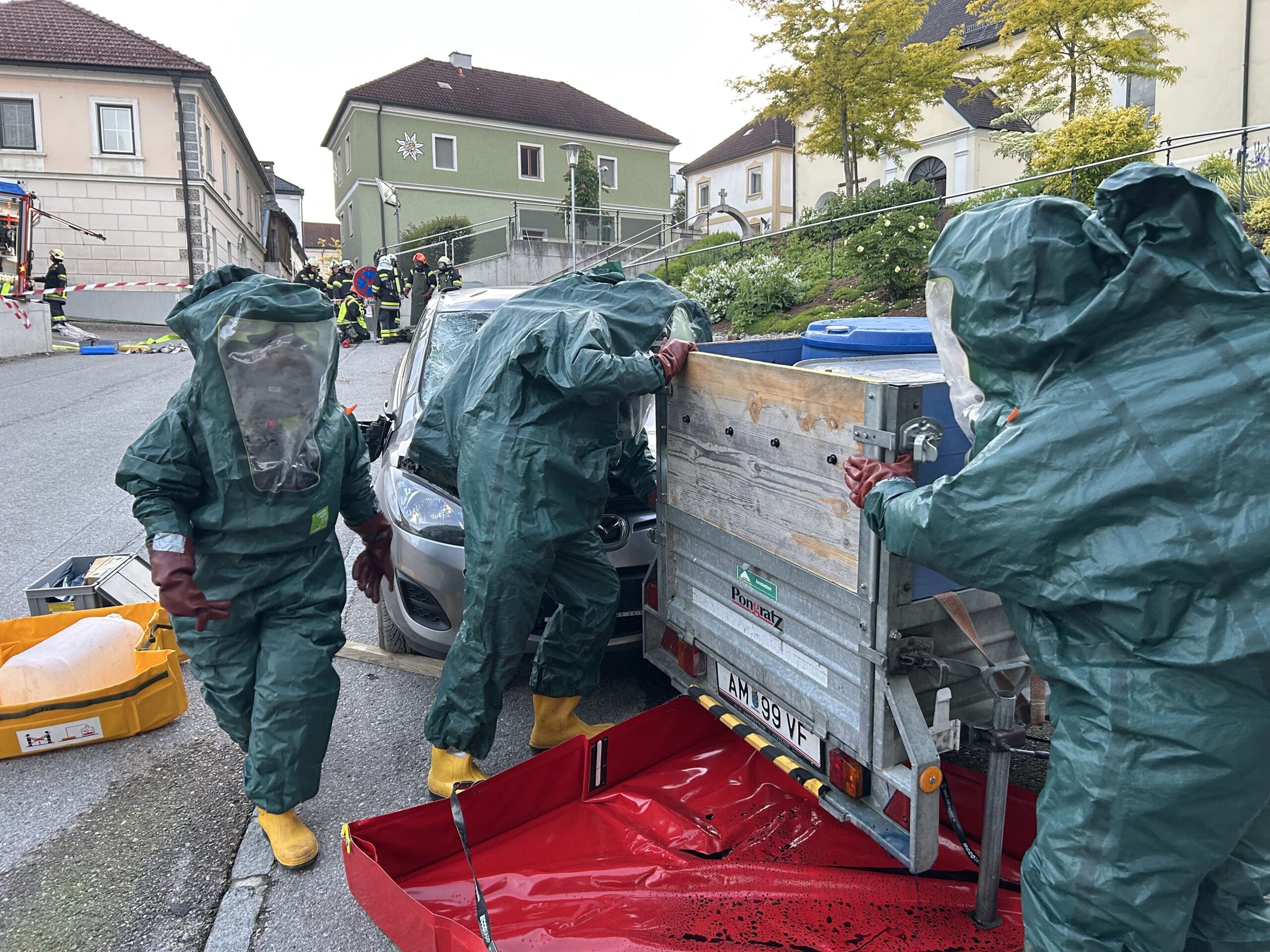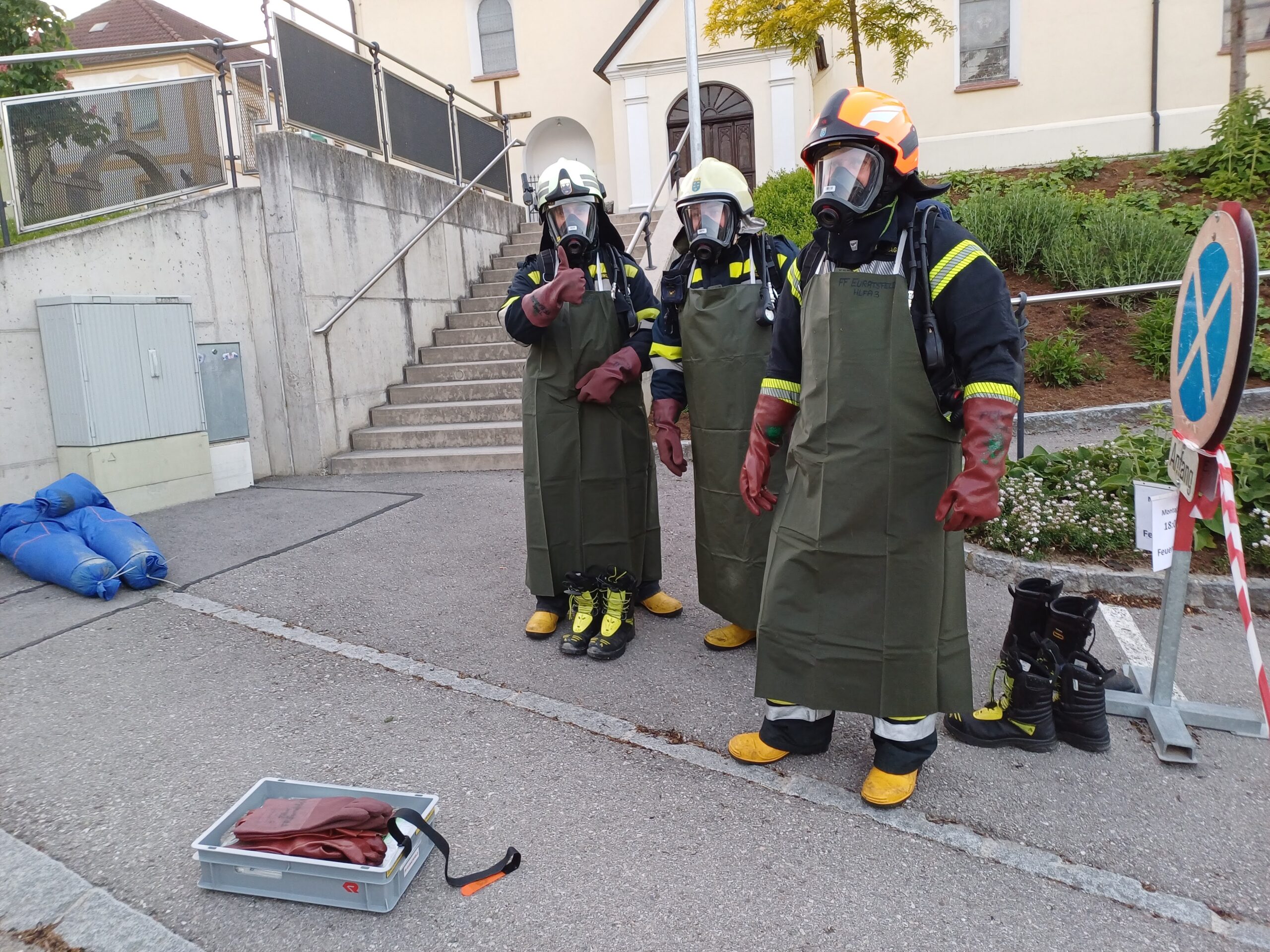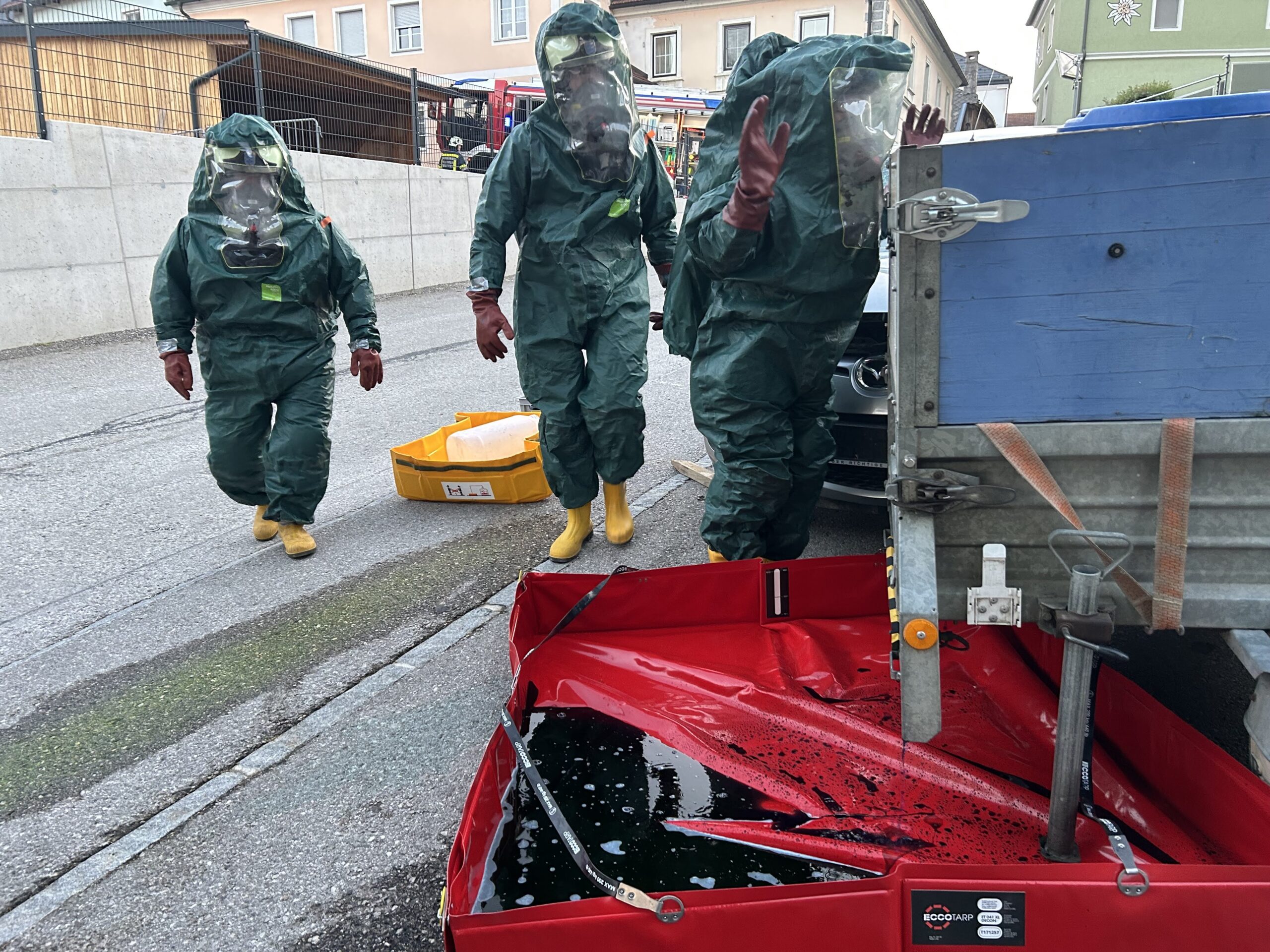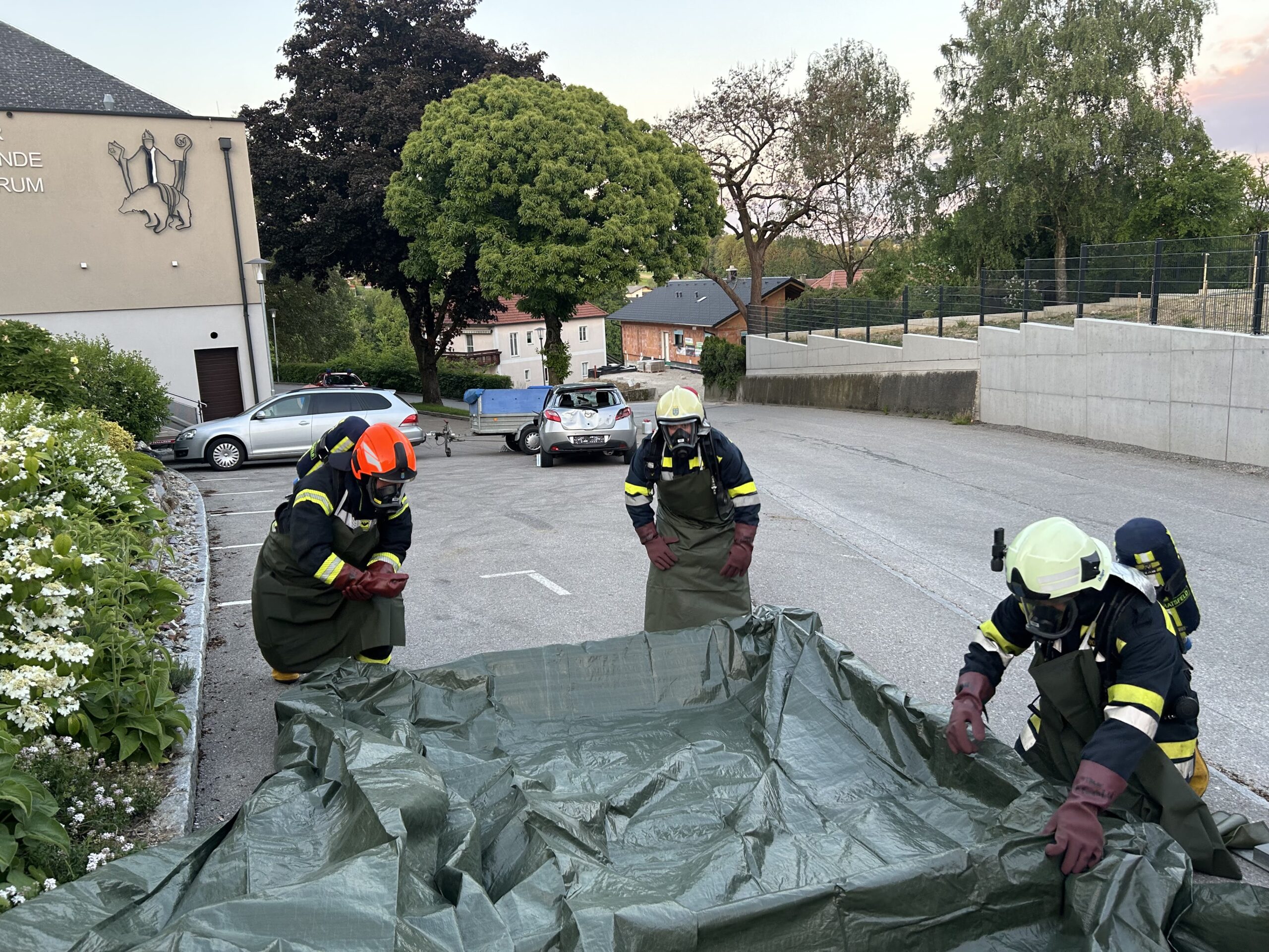 Bei der Ankunft stellte der Einsatzleiter fest, dass sichtlich eine Flüssigkeit austrat, worauf von Beginn an ein Sicherheitsabstand von mind. 30 Meter eingehalten wurde. Aufgrund der Situation konnten die Abstände in der Realität nicht ganz eingehalten werden und wurden auf die, mit der Gemeinde abgesprochene Übungsfläche, im Ortsgebiet reduziert. Ein Atemschutztrupp mit Schadstoffgrundausrüstung führte die Menschenrettung, aus dem Gefahrenbereich durch und führte dabei eine Ersterkundung durch. Parallel dazu wurde der Gefahrenbereich evakuiert, abgesperrt und mit einem Fernglas die Lage, von der Ferne aus, erkundet.