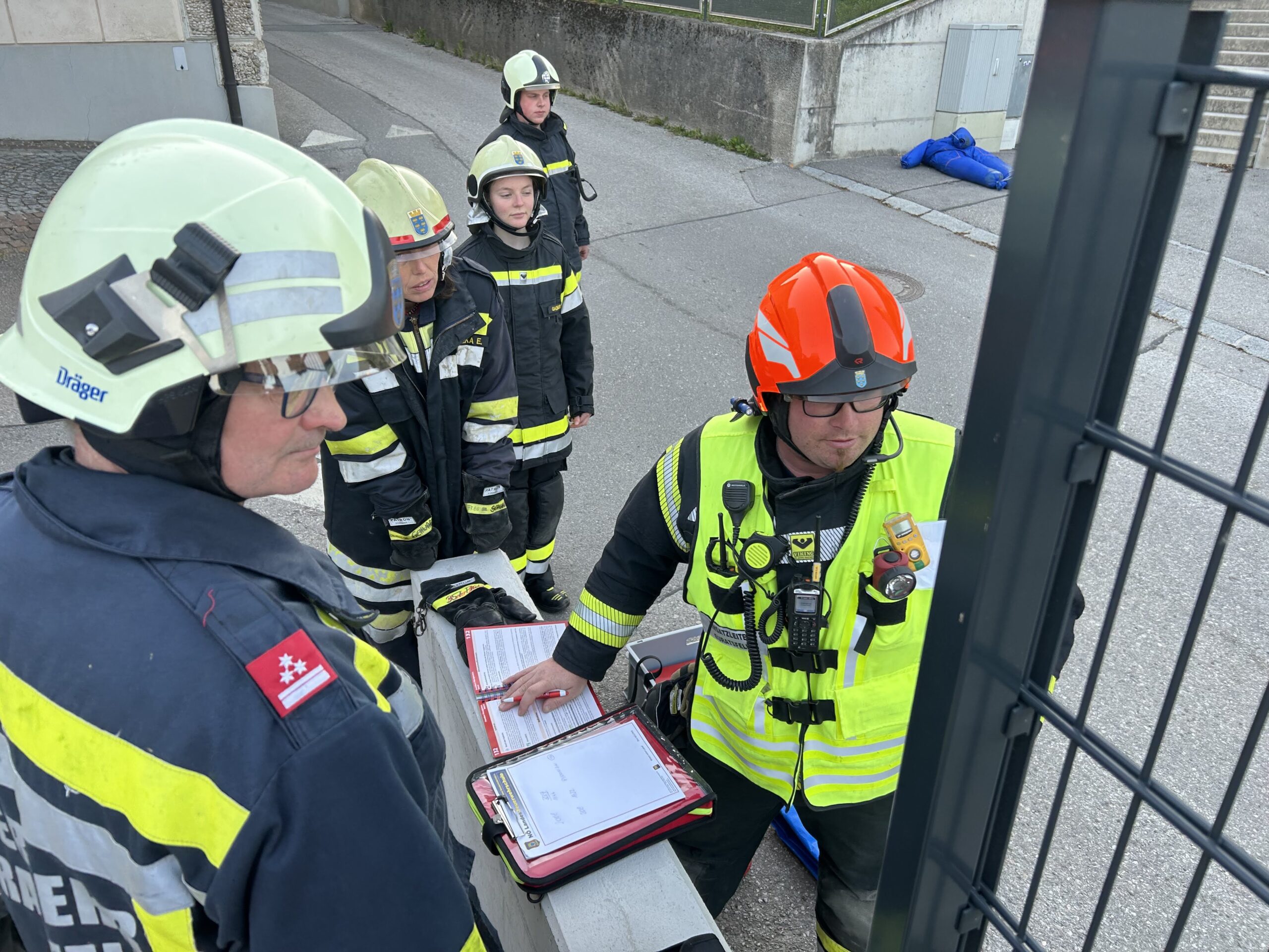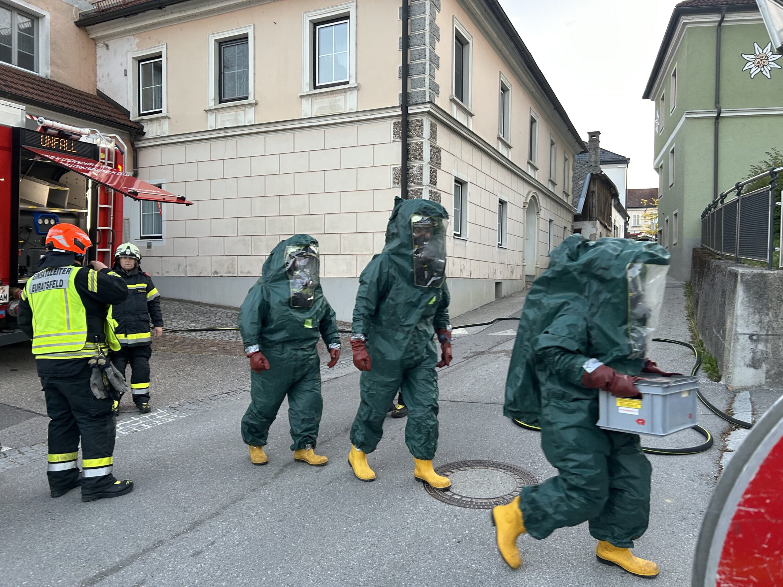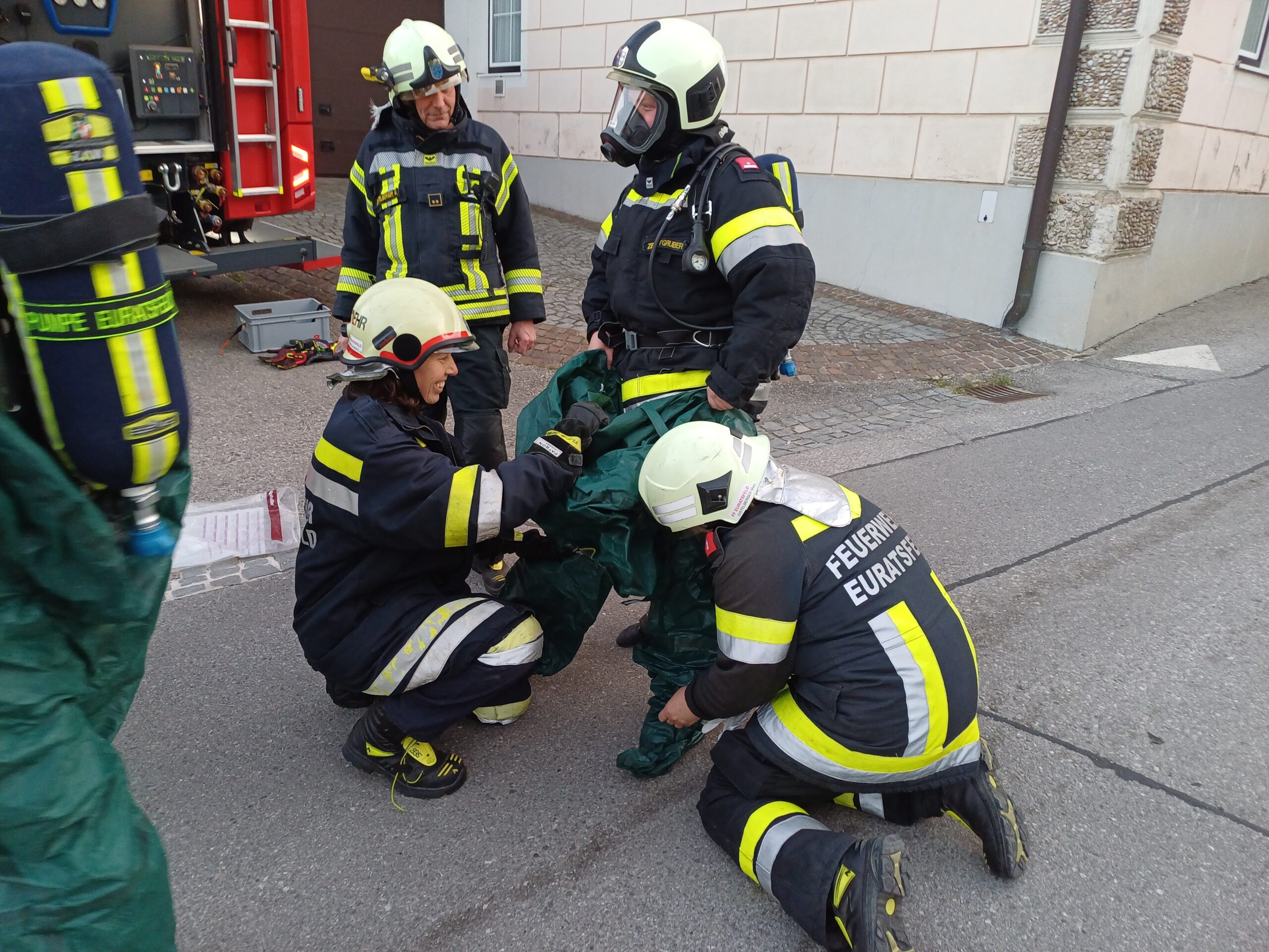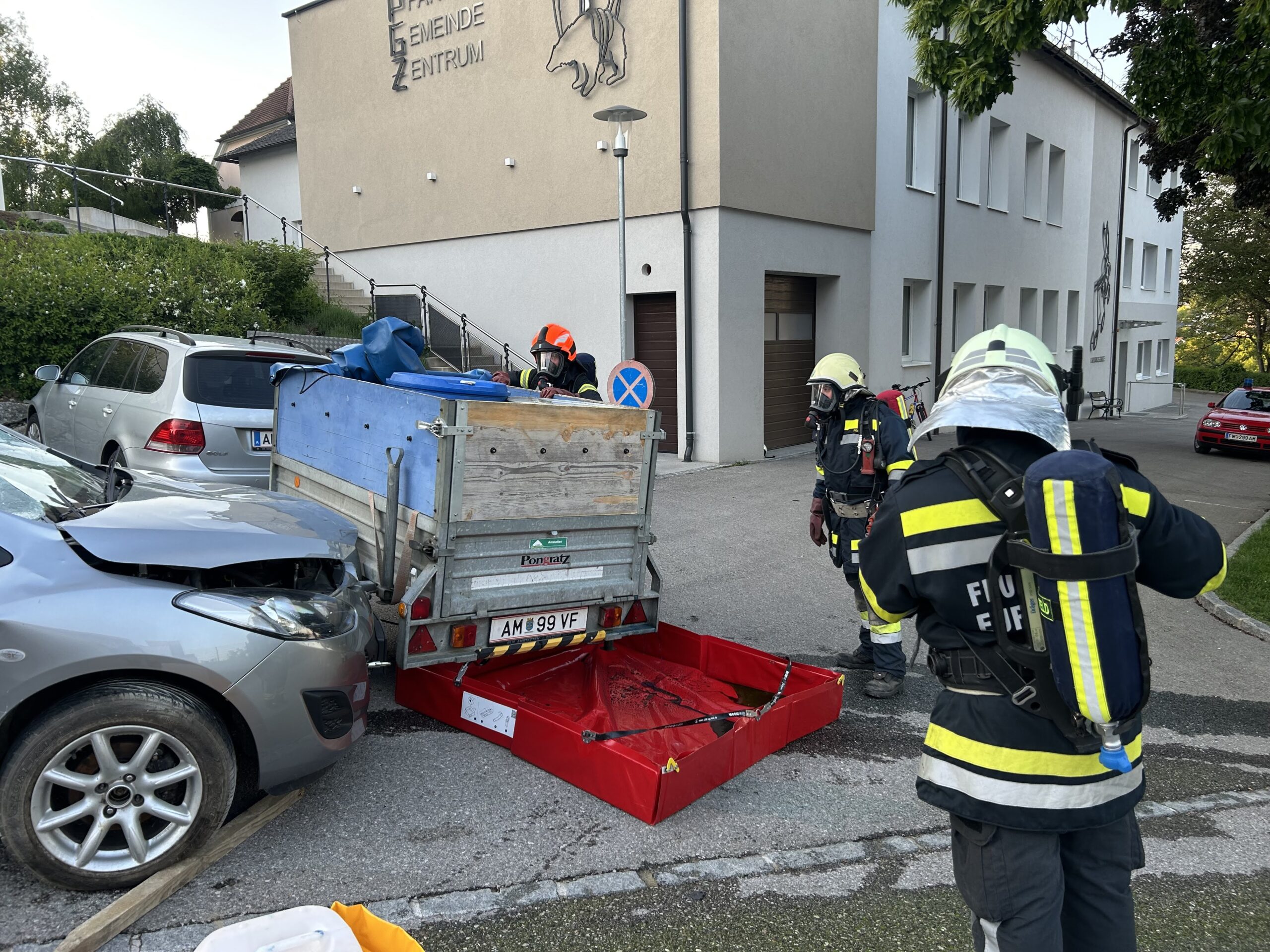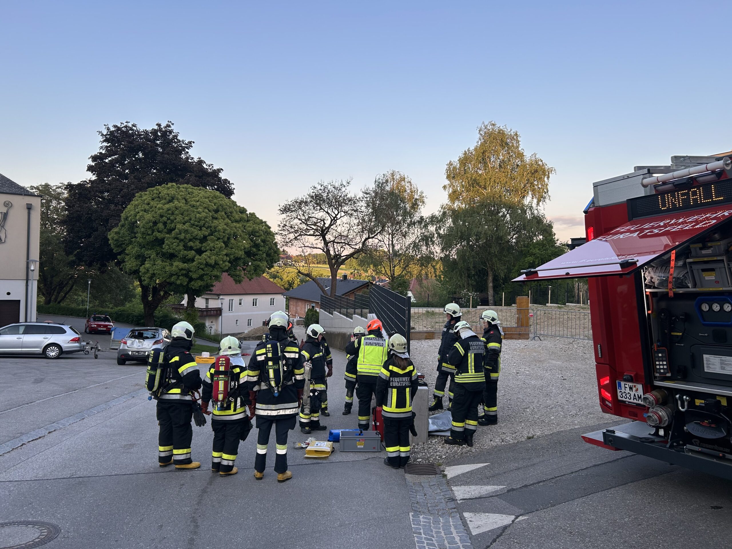 Bei der Ankunft stellte der Einsatzleiter fest, dass sichtlich eine Flüssigkeit austrat, worauf von Beginn an ein Sicherheitsabstand von mind. 30 Meter eingehalten wurde. Aufgrund der Situation konnten die Abstände in der Realität nicht ganz eingehalten werden und wurden auf die, mit der Gemeinde abgesprochene Übungsfläche, im Ortsgebiet reduziert. Ein Atemschutztrupp mit Schadstoffgrundausrüstung führte die Menschenrettung, aus dem Gefahrenbereich durch und führte dabei eine Ersterkundung durch. Parallel dazu wurde der Gefahrenbereich evakuiert, abgesperrt und mit einem Fernglas die Lage, von der Ferne aus, erkundet.