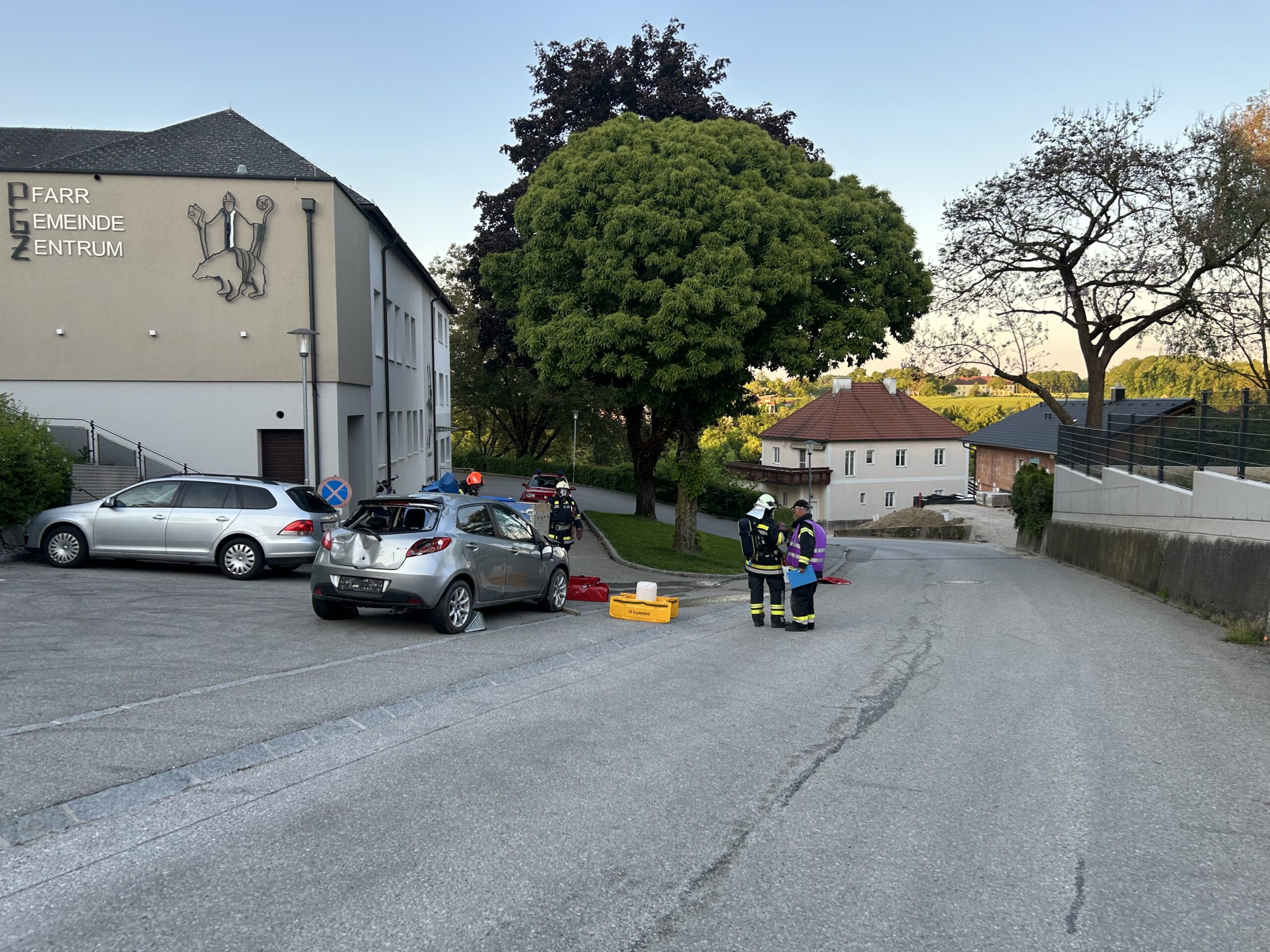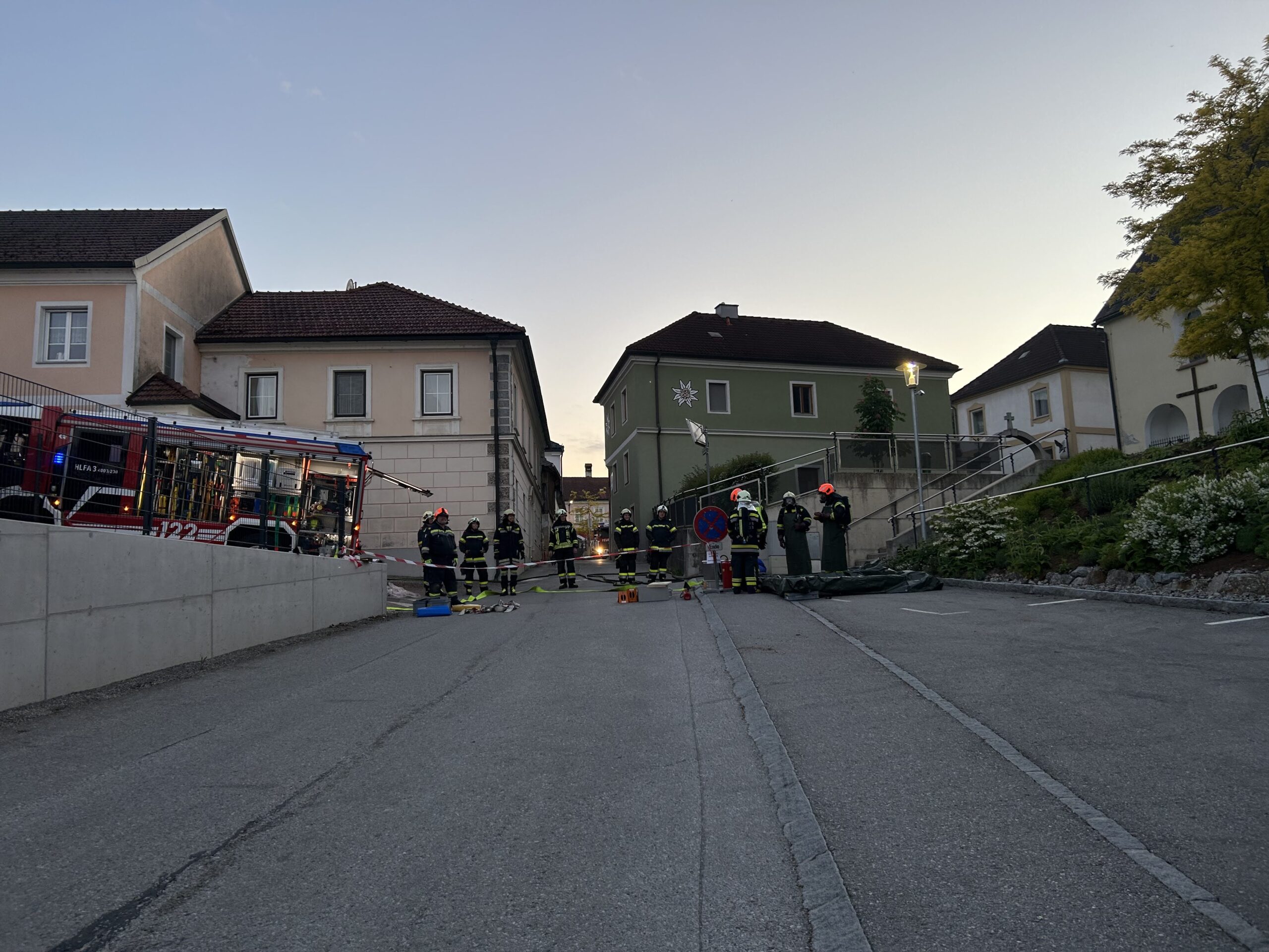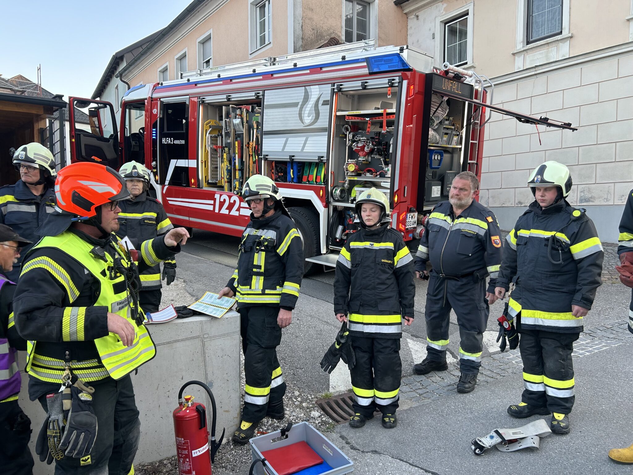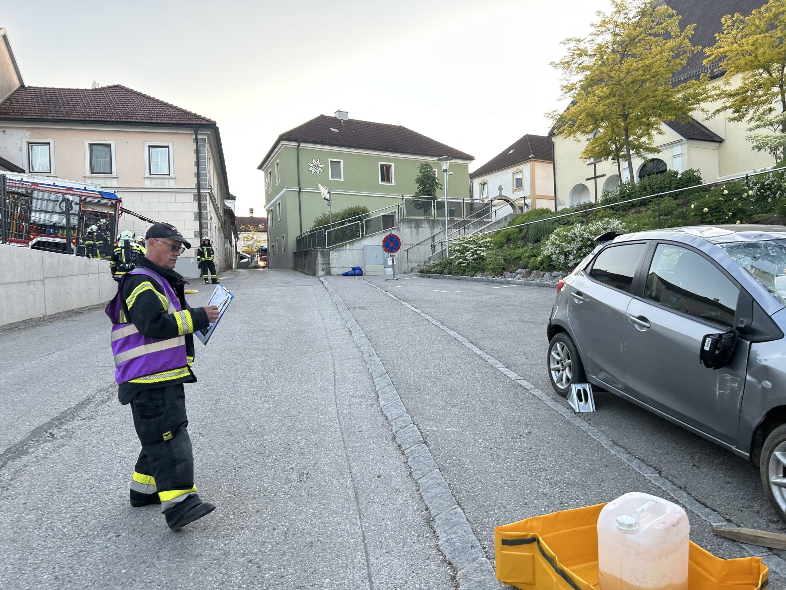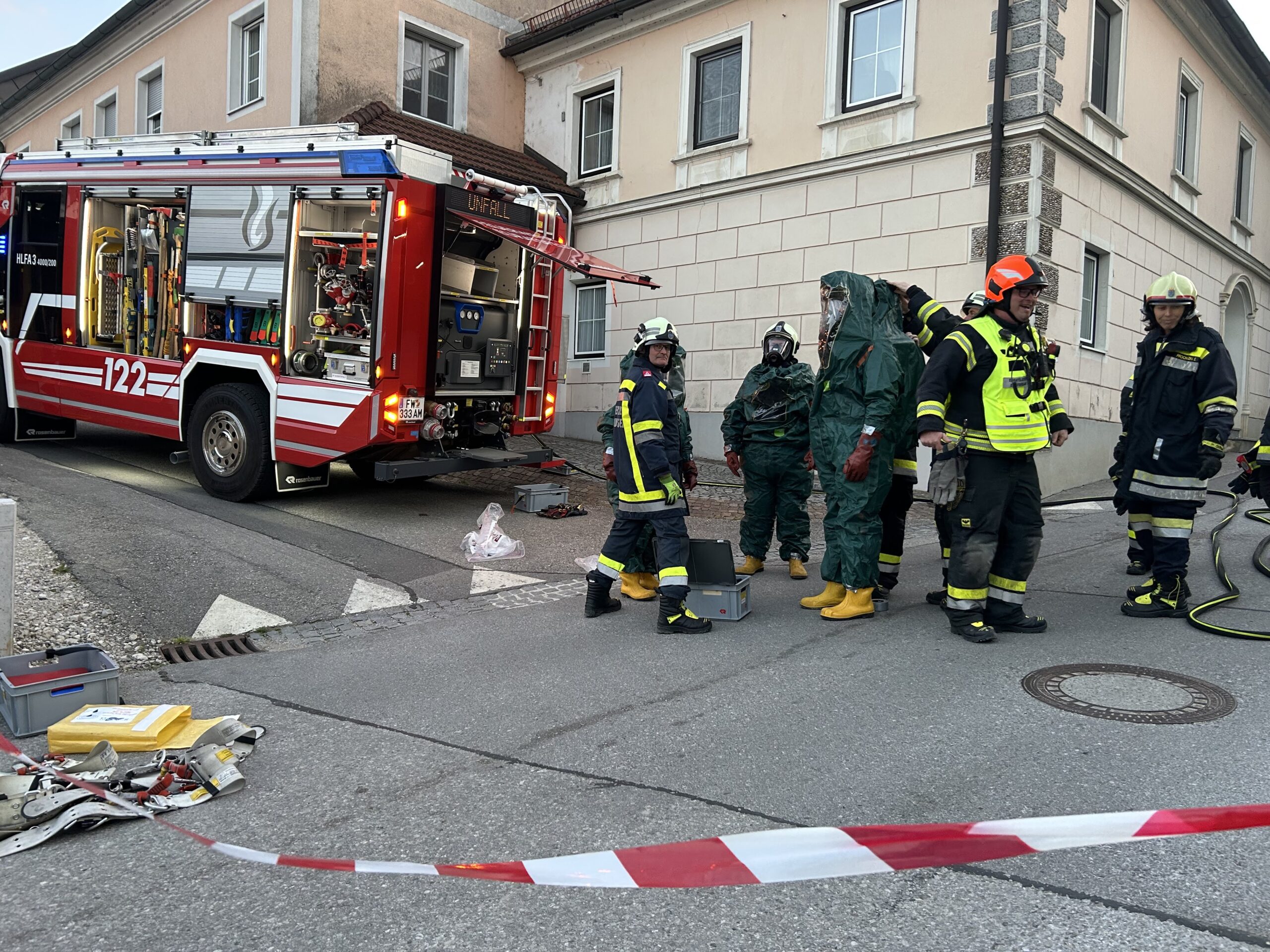 Bei der Ankunft stellte der Einsatzleiter fest, dass sichtlich eine Flüssigkeit austrat, worauf von Beginn an ein Sicherheitsabstand von mind. 30 Meter eingehalten wurde. Aufgrund der Situation konnten die Abstände in der Realität nicht ganz eingehalten werden und wurden auf die, mit der Gemeinde abgesprochene Übungsfläche, im Ortsgebiet reduziert. Ein Atemschutztrupp mit Schadstoffgrundausrüstung führte die Menschenrettung, aus dem Gefahrenbereich durch und führte dabei eine Ersterkundung durch. Parallel dazu wurde der Gefahrenbereich evakuiert, abgesperrt und mit einem Fernglas die Lage, von der Ferne aus, erkundet.