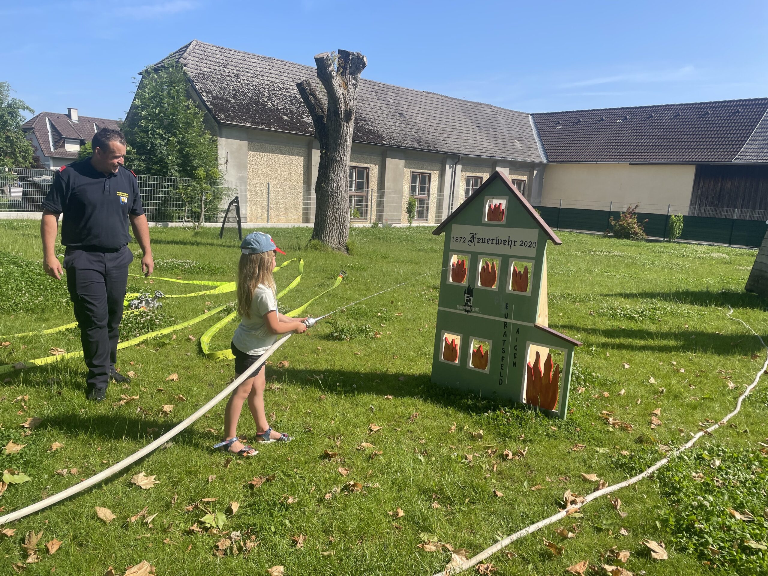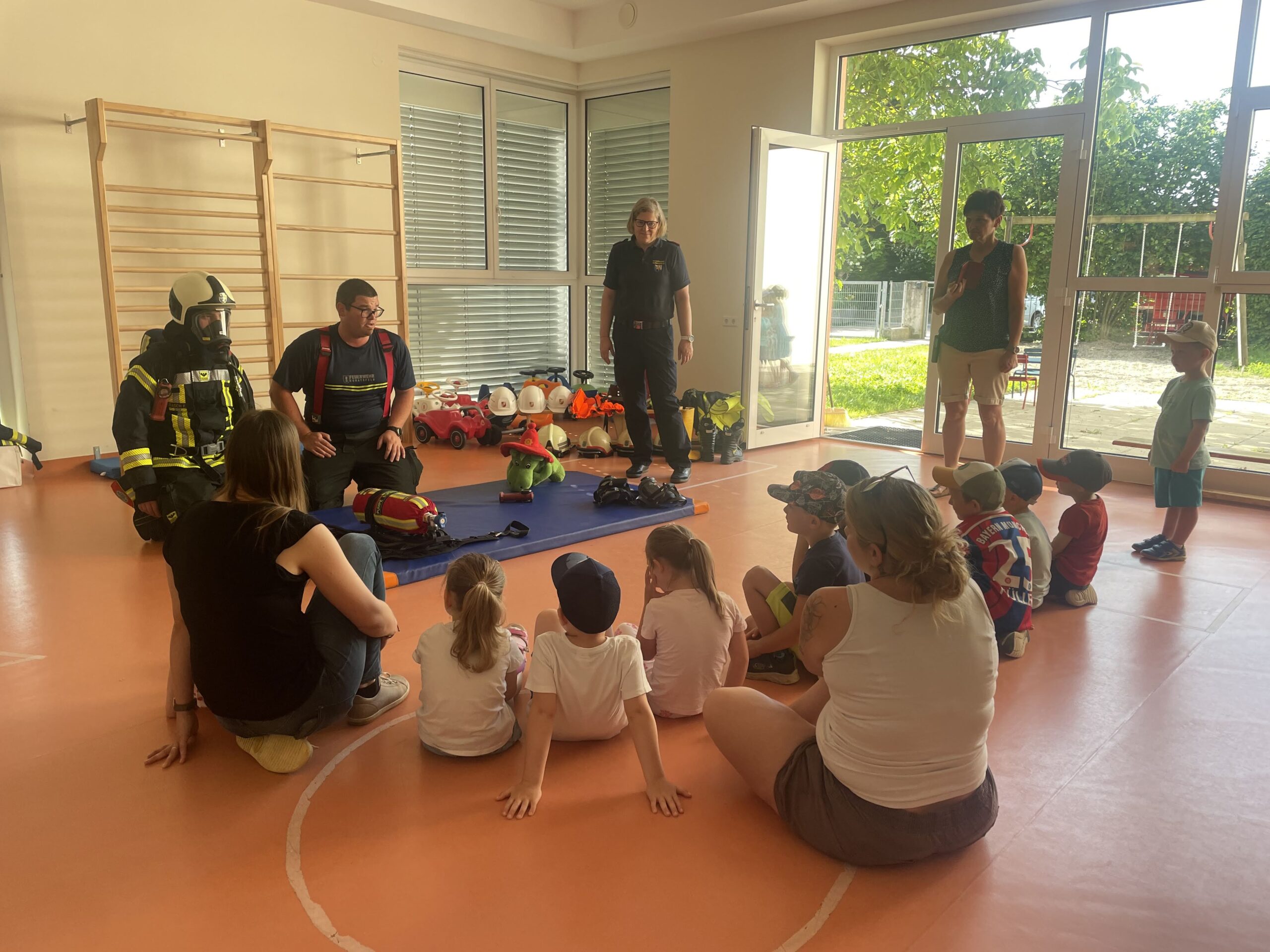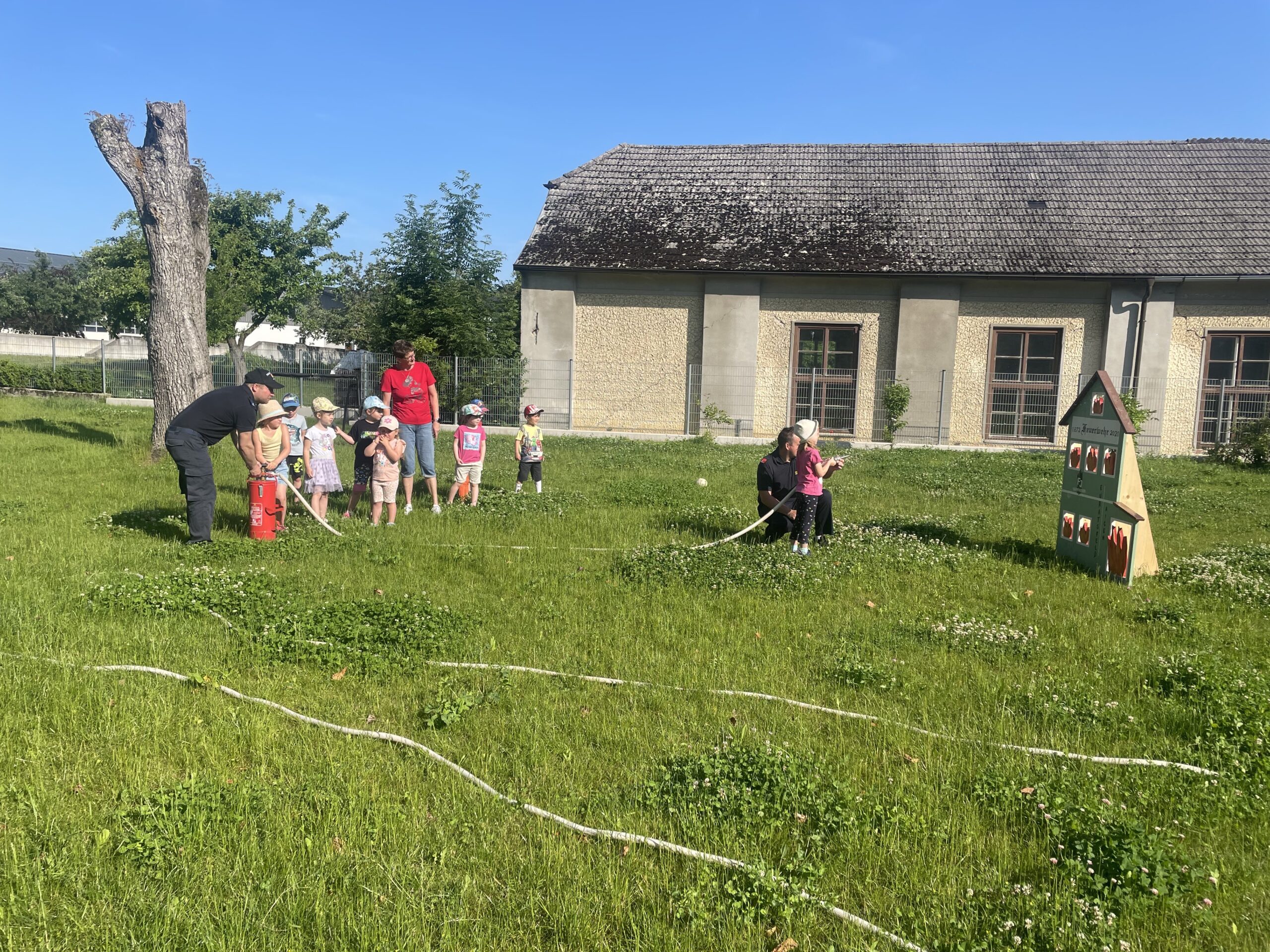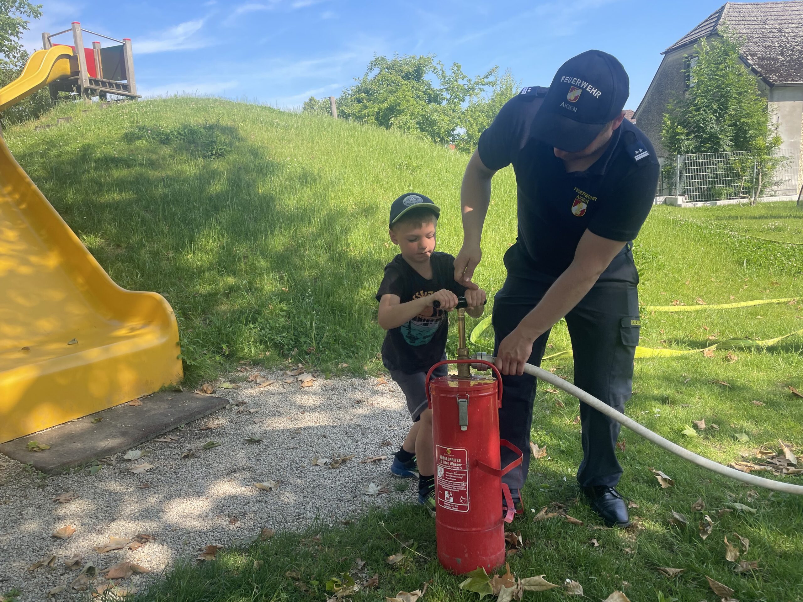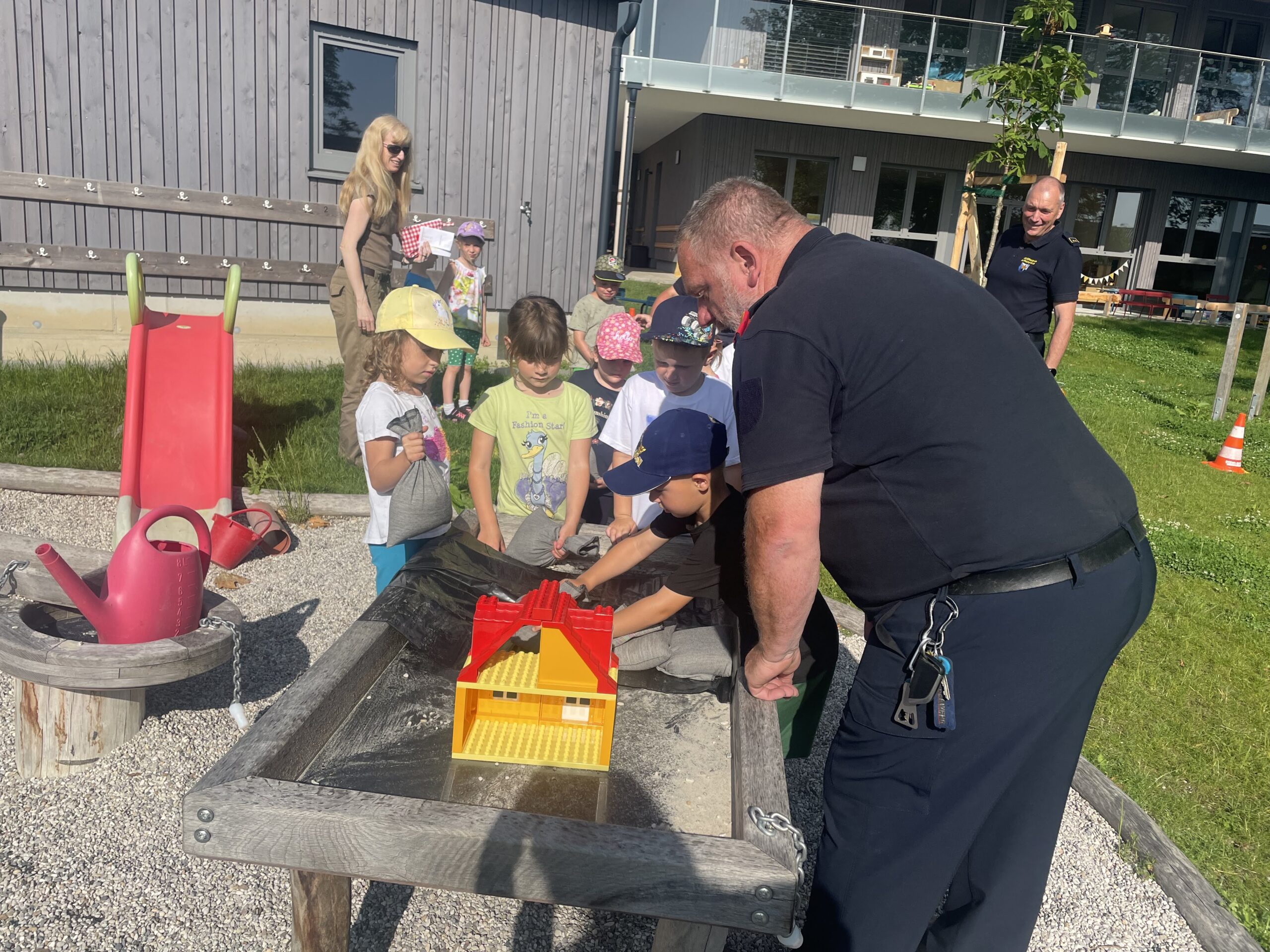 Gemeinsam mit den Pädagoginnen des Kindergarten Euratsfelds, wurde ein Kennenlernvormittag organisiert. Die Feuerwehr bekam die Chance, sich an einem Vormittag, in einer altersgerechten Form, bei den Kindern zu präsentieren und Ihnen die Aufgaben und Tätigkeiten zu erklären. Hierbei wurde ein großes Augenmerk darauf gelegt, dass die Kinder möglichst viel selbst ausprobieren konnten. Bei mehreren verschiedenen Stationen, war dies für die einzelnen Gruppen möglich. Die Besichtigung eines Einsatzfahrzeuges, Zielspritzen – Löschen eines Feuers sowie das Funken mit den Funkgeräten durfte nicht fehlen. Des Weiteren wurde mittels Spielzeug Sandsäcken ein Haus aus Duplo vor dem „Hochwasser“ geschützt, eine Stoffkatze vom Baum gerettet und die Übungsstellen abgesichert. Bei einer weiteren Station wurde die Einsatzbekleidung und das Atemschutzgerät erklärt, um den Kindern die Angst vor vollausgerüsteten Atemschutzgeräteträgern zu nehmen. Während der Erklärung durften die Kinder natürlich alles angreifen und beim Ausrüsten helfen. Im Anschluss konnten noch viele weitere Bekleidungsstücke der Feuerwehr selbst „angezogen“ werden. Der Vormittag war ein toller Erfolg und kam bestens bei den Pädagoginnen und Kindern an. Somit steht der geplanten Räumungsübung in der kommenden Woche nichts mehr im Wege.
