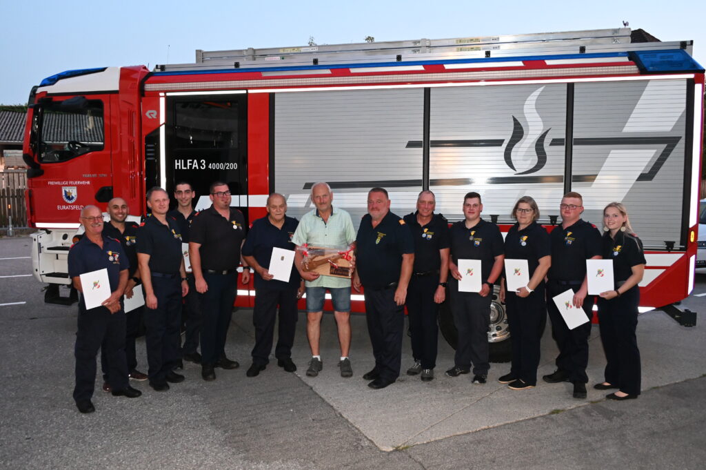 Langanhaltender Regen führte zu großflächigen Überschwemmungen in Niederösterreich im September 2024. Wie berichtet stand hierbei auch die FF Euratsfeld im eigenen Einsatzgebiet im Einsatz. Auch überörtlich wurde geholfen zum Beispiel in St. Georgen/Ybbsfelde, Amstetten und im Zuge des Katastrophenhilfsdienst in Loosdorf. Zehn Mitglieder wurden für die zahlreichen Stunden, welche zur Abwehr und Beseitigung der Gefahren aufgewendet wurden ausgezeichnet. Im gemütlichen und würdigen Rahmen wurden diese Auszeichnungen übergeben und nochmals Danke gesagt. Außerdem wurde die Chance genutzt und seitens der Politik, vertreten durch Bürgermeister Johann Weingartner, unser Mitglied Johann Koblinger sen. für 50 Jahre wertvoller Verdienste im Feuerwehr- und Rettungswesen geehrt. Koblinger Johann sen. war in der Funktion als Fahrmeister tätig und stand oftmalig gemeinsam mit seinen Mitgliedern im Einsatz. Aktuell ist er im verdienten Reservestand der Feuerwehr und unterstützt durch die Teilnahme an Veranstaltungen usw. weiterhin. Anfang Juli feierte unser Bürgermeister seinen 60igsten Geburtstag. An diesem Abend wurde ihm nochmals zu seinem Geburtstag gratuliert und für die jahrelange gute Zusammenarbeit sowie Unterstützung ein selbstgemachtes Strahlrohr überreicht. Bei einem gemeinsamen Abendessen lies man die Ehrungen gemütlich ausklingen. OBI Katzengruber Michael