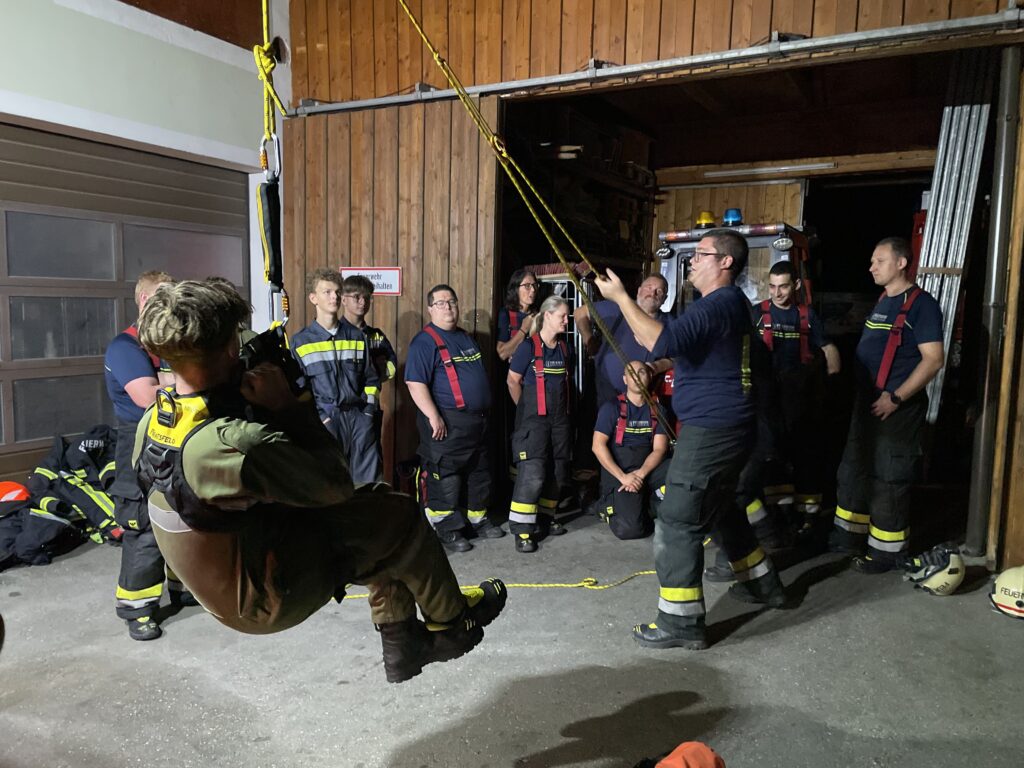 Seitens der FF Euratsfeld wird in den Einsatzfahrzeugen einiges an Ausrüstung für die Absturzsicherung mitgeführt. Genau diese Gerätschaften standen am 15.09.2025 im Mittelpunkt der Montagsschulung. Bei Einsätzen in der Höhe wie zum Beispiel bei Sicherungsarbeiten nach Sturm, Unwetter oder Bränden oder bei Einsätzen im unwegsamen Gelände, kommen genau diese Gerätschaften zum Einsatz und daher muss der Umgang geübt sein. Neben der Erklärung und Erläuterung einzelner Komponenten, wurden unteranderem die Möglichkeiten für ein Seilgeländer bzw. provisorischer Handlauf besprochen. Im Zuge wurde auch die Knotenkunde wiederholt und gefestigt. Zum Abschluss wurde noch gezeigt, welche Möglichkeiten das Abseilgerät „ID“ noch alles bietet. Die Übungsteilnehmer konnten in den rund 1,5 Stunden wieder viele wichtige Erkenntnisse gewinnen und ihr bereits vorhandenes Wissen festigen. OBI Katzengruber Michael