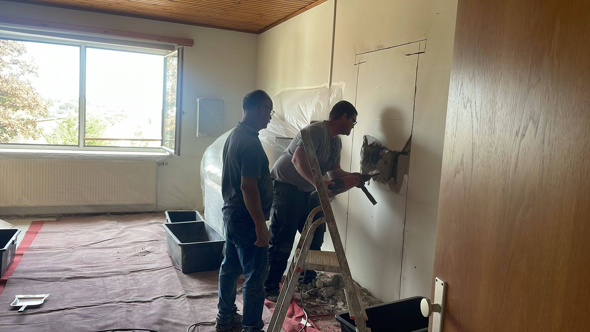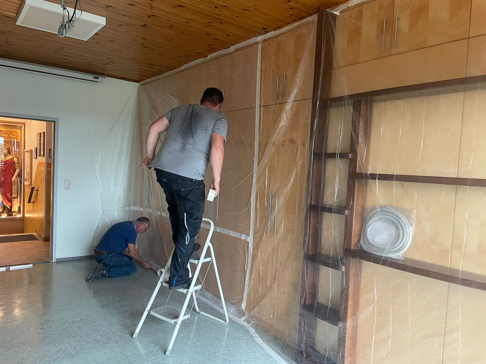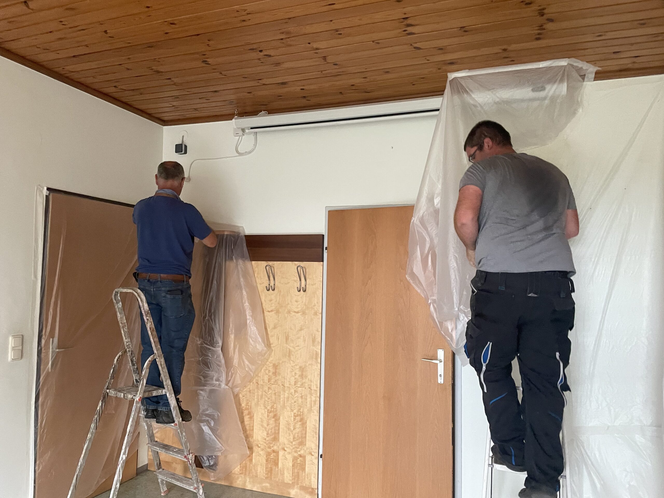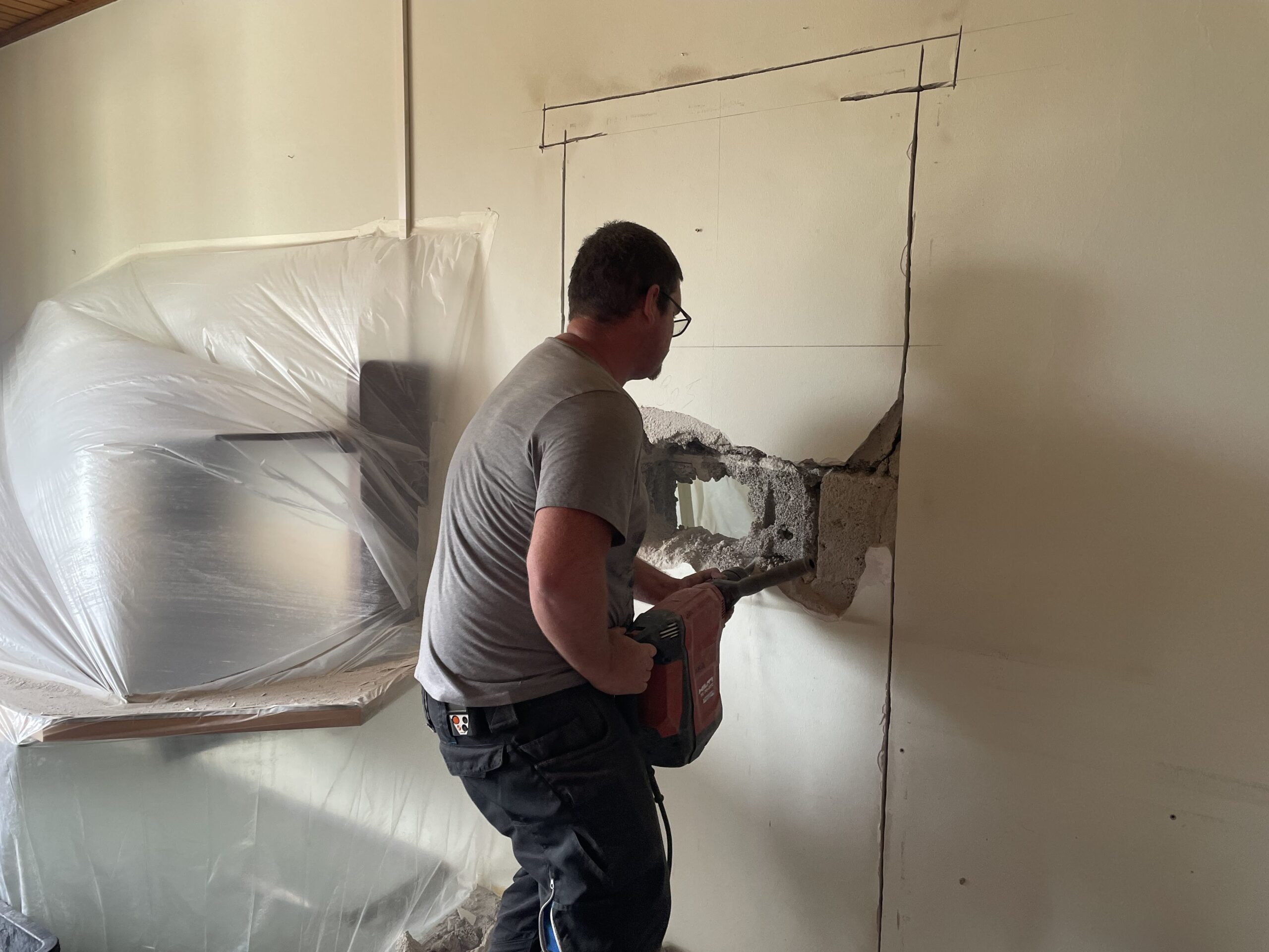 Aufgrund des Platzbedarfes im Aufenthaltsraum und einiger weiteren Überlegungen, entschied man sich im Obergeschoss zwei Büroräumlichkeiten zu tauschen. Hierfür war es notwendig, eine neue Durchgangsmöglichkeit zu schaffen. Dies erledigten die Mitglieder natürlich wieder selbst und so entstanden nur geringe Materialkosten für die Feuerwehr. Nach dem Ausräumen der Räumlichkeiten und dem Abkleben des Mobilares, wurde mit den Stemmarbeiten begonnen. Anschließend wurde der neue Türstock versetzt und die Wand wieder verputzt sowie der fehlende Boden im Bereich des Türstockes betoniert. Abschließend wurde noch das Türblatt angepasst und entsprechend angeschlagen. Durch den Tausch der Büros, haben die Chargen & Sachbearbeiter zukünftig mehr Platz zu Verfügung und können die verschiedenen Medien für Ausbildungen, im kleinen Kreise besser zum Einsatz bringen. Die Vergrößerung des Aufenthaltsraumes wurde aufgrund des erfreulichen, ständig wachsenden Mitgliederstandes, notwendig.